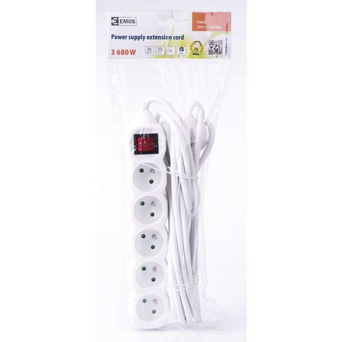 - Pprodlužovací přívod, 5 zásuvka s vypínačem, délkou až 10m a průřezem vodiče 1 mm2. Vhodný pro maximální zátěž 16 A max.
