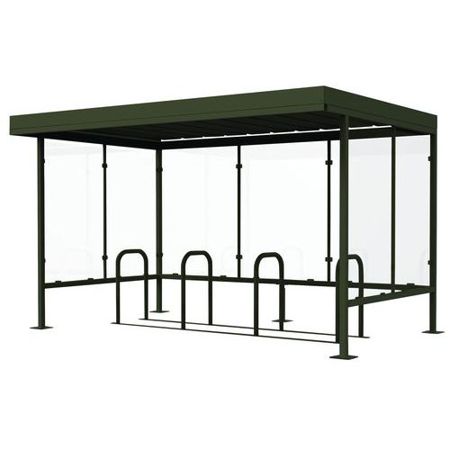 - Prosklený přístřešek se stojanem na kola chrání kola před deštěm a nepříznivým počasím.