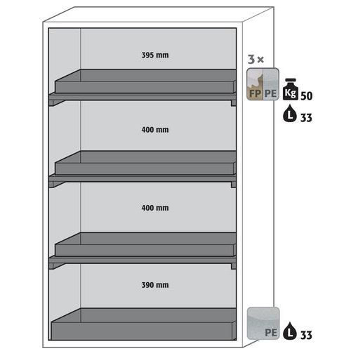 Protipožární skříň na hořlaviny Asecos, 1968 x 1196 x 616 mm, PP, 3 záchytné police, vana, 33 l