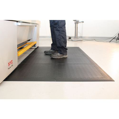 - Protiúnavové průmyslové rohože pro suché prostředí se skládají z dlaždic, jejichž spojením lze přizpůsobit velikost rohože rozměrům prostoru.