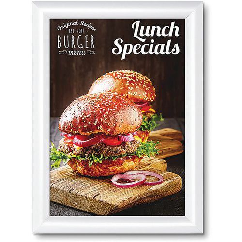Plakátové rámy vhodné pro prezentaci letáků, fotografií, plakátů a speciálních nabídek. Jednoduchá a rychlá výměna plakátů odklopením bočních hliníkových profilů. Zadní stěna vyrobená z plastu v šedé barvě, přední antireflexní UV fólie. Možnost umístění na šířku nebo výšku.