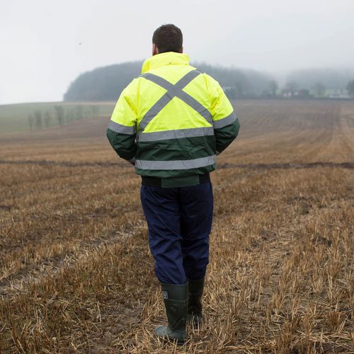 Bomber bunda s vysokou viditelností díky reflexnímu kříži na zádech.
