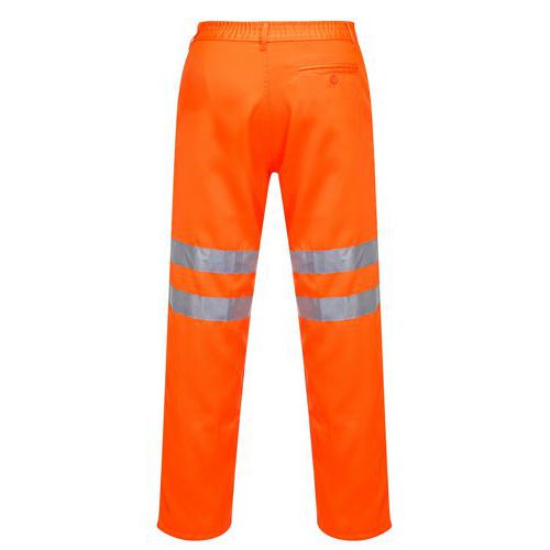 Pracovní kalhoty v prodlouženém provedení s reflexními prvky pro práci v železničním odvětví.