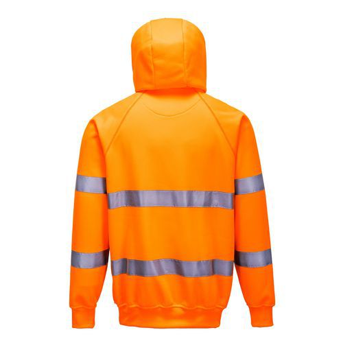 Reflexní oranžová mikina s kapucí a přední kapsou pro ukládání věcí. Plně elastický pás a manžety pro pohodlné nošení, kapuce se stahovacími šňůrkami. Tkanina odráží 98 % UV záření (50+ UPF). Vyrobeno z 65% polyesteru a 35% bavlny 300 g. Splňuje normy ANSI/ISEA 107-2015 TYPE R Třída 3, AS/NZS 4602.1:2011 Třída D/N, RIS-3279-TOM ISSUE 1, EN ISO 20471 Třída 3.