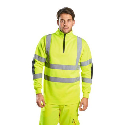 Teplá reflexní mikina se zipem na hrudi a vysokým límcem. Vyztužené panely v namáhavých místech, manžety na rukávech. Tkanina odráží 98 % UV záření (50+ UPF). Vyrobeno z 65% polyesteru a 35% bavlny 300 g, kontrastní tkanina 100% polyester 600D 210 g. Splňuje normy ANSI/ISEA 107-2015 TYPE R Třída 3, EN ISO 20471 Třída 3.