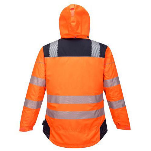 Pracovní zimní bunda s reflexními prvky pro vysokou viditelnost. Nepromokavá bunda s lepenými švy, prošitá podšívka pro uchování tepla. Skrytá kapsa na mobil, boční kapsy na zip, nastavitelné manžety na suchý zip, stahování v pase. Tkanina odráží 98 % UV záření (50+ UPF), vodní sloupec 15 000 mm. Vnější tkanina 100% polyester, PU zátěr 190 g. Podšívka 100% polyester 60 g, výplň 100% polyesterová vata 170 g. Splňuje normy EN ISO 20471 Třída 3, RIS-3279-TOM ISSUE 2 (ORANGE ONLY), EN 343:2019 Třída 3:1 X WP 15,000mm, EN 342 0.323 (M².K/W), 2, X, ANSI/ISEA 107-2015 TYPE R Třída 3. 300D Oxford Weave je materiál vyrobený ze 300 Denier 100% polyesteru, má vysokou odolnost proti roztržení, voděodolný povrch a pomáhá udržovat tkaninu déle čistou. Povrchová úprava TEXPEL™ - SPLASH: Extrémní odolnost vůči vodě, vysoká prodyšnost, pomáhá odpuzovat nečistoty a předcházet skvrnám. EZEE ZIP™: Inovativní zip vhodný pro leváky i praváky, kde lze zvolit stranu jezdce.
