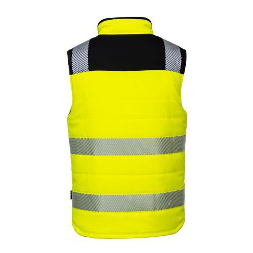 Zateplená vesta s výrazně žlutou barvou a reflexními doplňky zvyšuje viditelnost nositele. Díky oboustrannému využití lze oděv využít jak v práci tak i pro volný čas. Součástí je kapsa na mobilní telefon, kroužek pro připevnění např. klíčů a dvě boční kapsy na zip. Dobrou izolaci zajišťuje prošitá podšívka. Přední oboustranné zapínání na zip. Tkanina 65% polyester, 35% bavlna 245 g/m2, podšívka Insulatex 300 g/m2. Splňuje normy EN ISO 20471 Třída 2 a ANSI/ISEA 107 TYP R Třída 2. Povrchová úprava TEXPEL™ - SPLASH, OIL + STAIN: Povrchová úprava tkaniny, která pomáhá chránit před oleji a mazivy, zvýšená odolnost vůči vodě a zároveň pomáhá udržet měkkost tkaniny. Vyrobeno v EU
