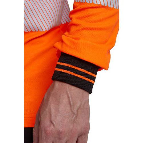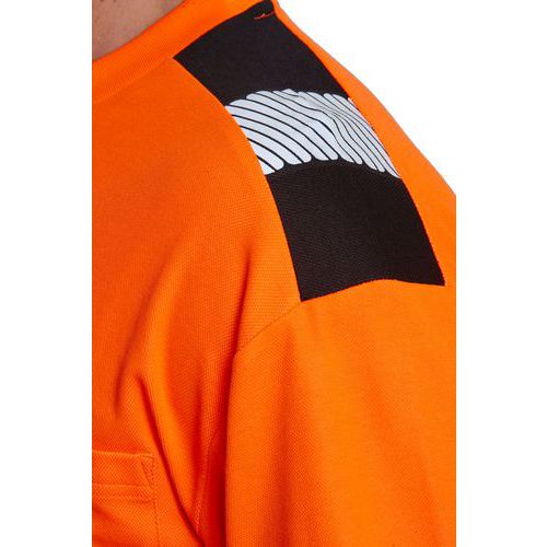 Výstražné triko se dvěma reflexními pruhy a s manžetami na rukávech. Díky své výrazné oranžové barvě je vhodné do železničního průmyslu. Praktická náprsní kapsa pro uložení věcí. Použitý materiál odvádí z těla vlhkost a pomáhá udržet tělo v suchu a teple. Tkanina odráží 97% UV záření (35+UPF). Materiál 55% bavlna, 45% polyester, Knit 175 g/m2. Splňuje normy EN ISO 20471 Třída 3, ANSI/ISEA 107-2015 TYPE R Třída 3 a RIS 3279-TOM Vydání 1.