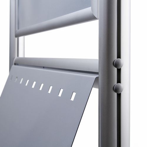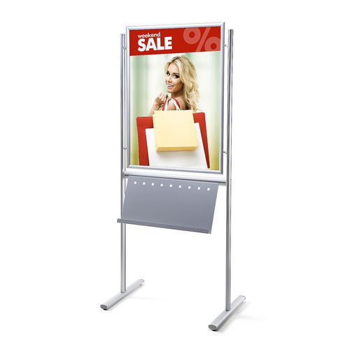 Informační stojany s rámem na plakáty. Ve spodní části se nachází prostor pro umístění plechové kapsy na brožury, katalogy a jiné prospekty. Klaprám s ostrými rohy a profilem 25 mm. Vyrobeno v EU