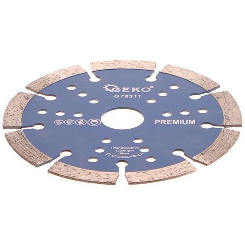 Kvalitní diamantový segmentový řezný kotouč GEKO s rozměry 125 x 22 x 10 mm vhodný pro hluboké řezání tvrdých stavebních materiálů za mokra i za sucha.