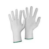 Komfortní bezešvé textilní rukavice. Dlaň a prsty pokryty drobnými PVC terčíky. Pružná pletená manžeta. Rukavice jsou určené pro kontakt se suchými typy potravin po dobu až 30 minut při teplotách do 40 °C pro opakované použití. Doporučené použití: skladování, manipulace s lehkým a drobným materiálem, kontakt se suchými potravinami, jemná montáž.
