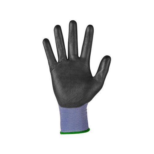 - Pletené bezešvé rukavice s pružnou manžetou, dlaně a prsty povrstveny polyuretanem. Hustota tkaní 18 G pro větší flexibilitu a citlivost.