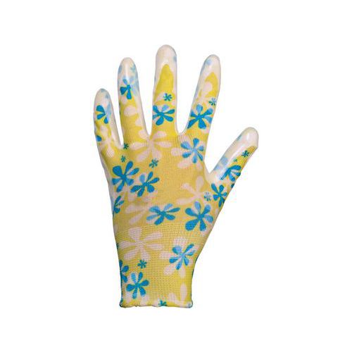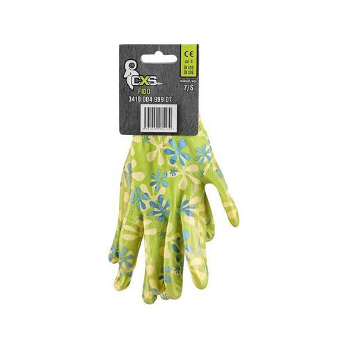 - Rukavice s potiskem, dlaň a prsty máčené v nitrilu. Doporučené použití: zahrada, hobby.