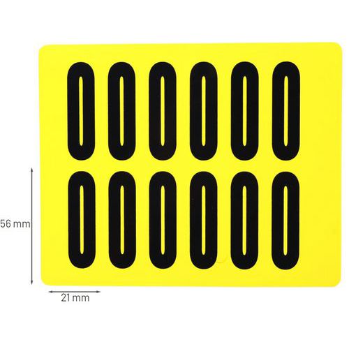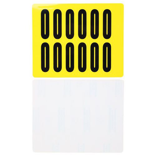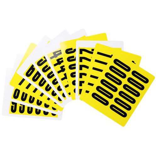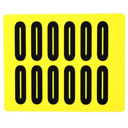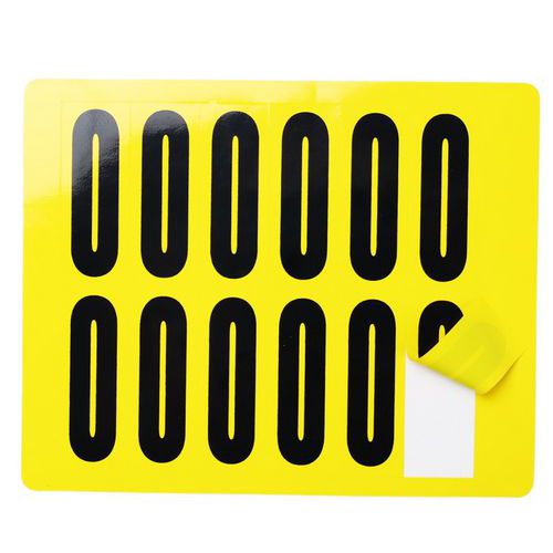 - Černé číslice na žlutém podkladu vyrobené z vinylu jsou dodávány v osmi různých velikostech.