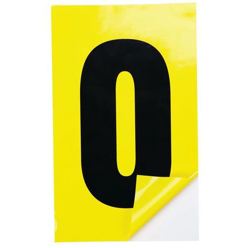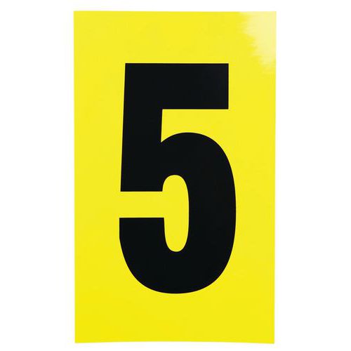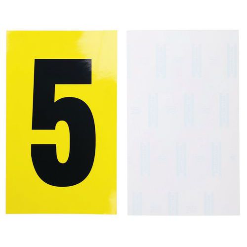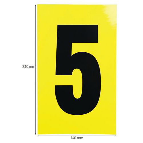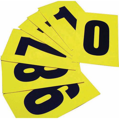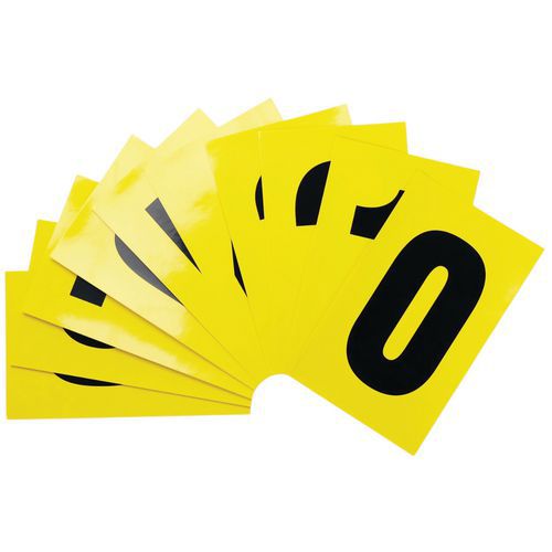 - Černé číslice na žlutém podkladu vyrobené z vinylu jsou dodávány v osmi různých velikostech.
