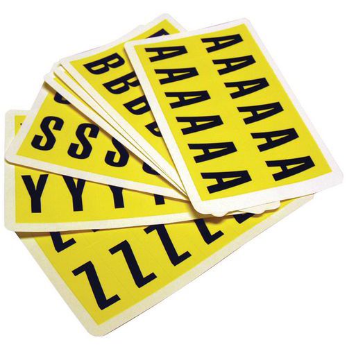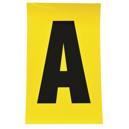 - Černá písmena na žlutém podkladu vyrobené z vinylu jsou dodávány v osmi různých velikostech.