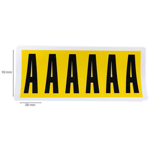 - Černá písmena na žlutém podkladu vyrobené z vinylu jsou dodávány v osmi různých velikostech.