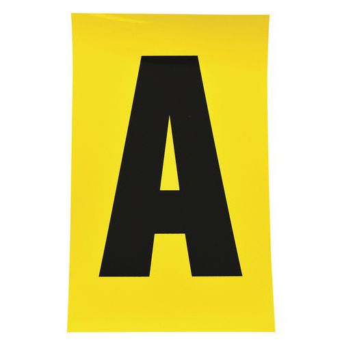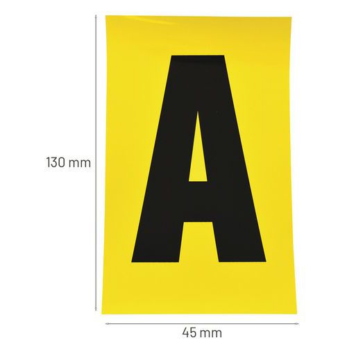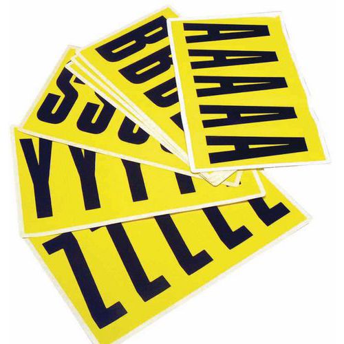 - Černá písmena na žlutém podkladu vyrobené z vinylu jsou dodávány v osmi různých velikostech.