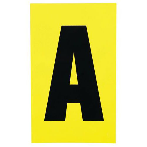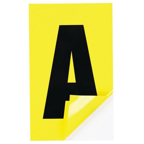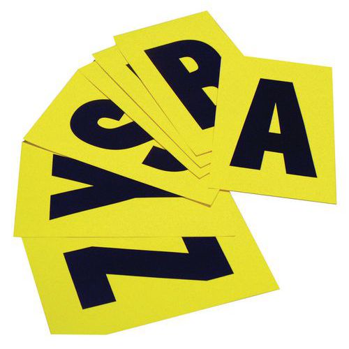 - Černá písmena na žlutém podkladu vyrobené z vinylu jsou dodávány v osmi různých velikostech.