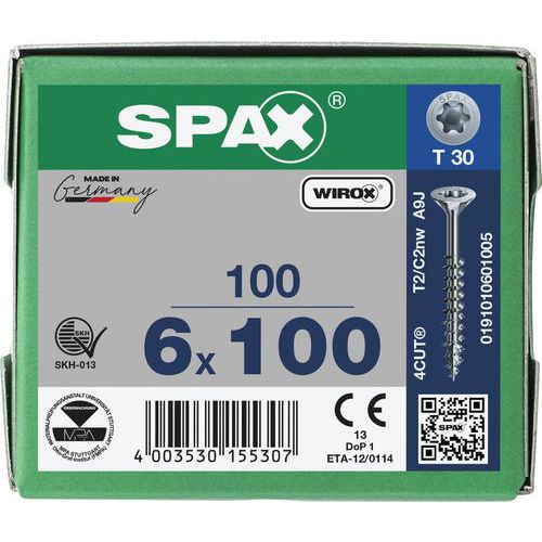 - Vysoce kvalitní univerzální šrouby SPAX s plnými závity jsou navrženy pro rychlou, efektivní a čistou práci ve dřevě, bez nutnosti předvrtání.