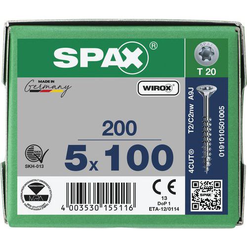 - Vysoce kvalitní univerzální šrouby SPAX s plnými závity jsou navrženy pro rychlou, efektivní a čistou práci ve dřevě, bez nutnosti předvrtání.