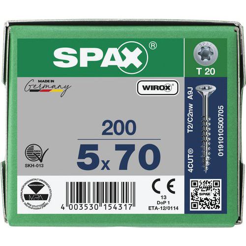 - Vysoce kvalitní univerzální šrouby SPAX s plnými závity jsou navrženy pro rychlou, efektivní a čistou práci ve dřevě, bez nutnosti předvrtání.
