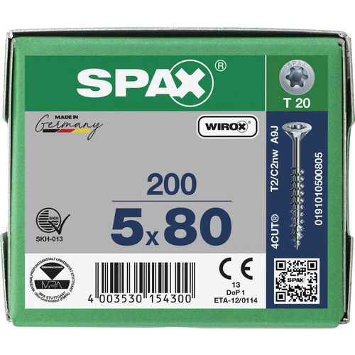 Univerzální šrouby SPAX s plným závitem - zapuštěná hlava, samořezný hrot. Vysoce kvalitní univerzální šrouby SPAX s plnými závity jsou navrženy pro rychlou, efektivní a čistou práci ve dřevě, bez nutnosti předvrtání. Díky speciální konstrukci hlavy a hrotu jsou ideální pro použití v dřevostavbách, montážích nábytku či interiérových úpravách. Zapuštěná hlava s polygonální spodní částí se při utahování sama zařezává do materiálu, není tedy nutné nic předvrtávat. Samořezný hrot se čtvercovým profilem vytlačuje dřevní vlákna, čímž vytváří přesný prostor pro tělo šroubu. Plný závit po celé délce zajišťuje pevné a rovnoměrné spojení. Antikorozní úprava pro delší životnost a použití i ve vlhčím prostředí. Vyrobeno v Německu