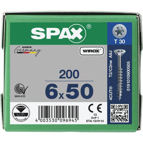 Univerzální šrouby SPAX s plným závitem - zapuštěná hlava, samořezný hrot. Vysoce kvalitní univerzální šrouby SPAX s plnými závity jsou navrženy pro rychlou, efektivní a čistou práci ve dřevě, bez nutnosti předvrtání. Díky speciální konstrukci hlavy a hrotu jsou ideální pro použití v dřevostavbách, montážích nábytku či interiérových úpravách. Zapuštěná hlava s polygonální spodní částí se při utahování sama zařezává do materiálu, není tedy nutné nic předvrtávat. Samořezný hrot se čtvercovým profilem vytlačuje dřevní vlákna, čímž vytváří přesný prostor pro tělo šroubu. Plný závit po celé délce zajišťuje pevné a rovnoměrné spojení. Antikorozní úprava pro delší životnost a použití i ve vlhčím prostředí.