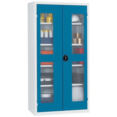 - Svařovaná dílenská skříň z ocelového plechu s průhlednými dveřmi z materiálu LUMEX PET.