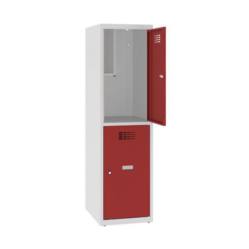 Snížená školní šatní skříň, 2 oddíly, 400 mm, šedá/červená, cylindrický zámek
