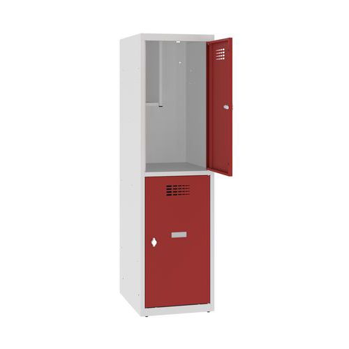 Snížená školní šatní skříň, 2 oddíly, 400 mm, šedá/červená, otočný uzávěr