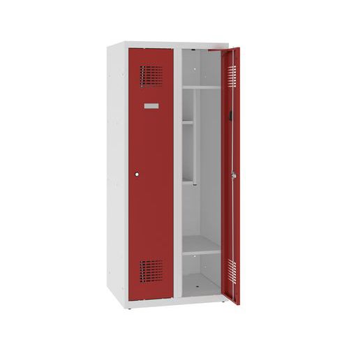 Snížená školní šatní skříň, 2 sloupce, 300 mm, šedá/červená, tříbodový cylindrický zámek