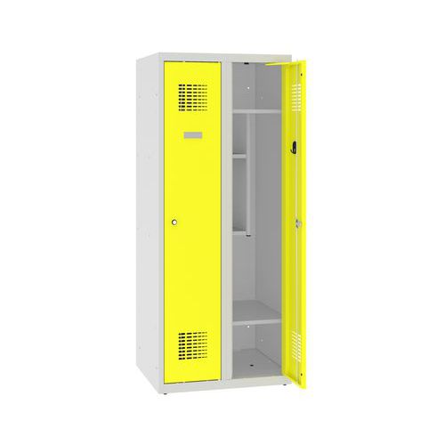Snížená školní šatní skříň, 2 sloupce, 300 mm, šedá/žlutá, tříbodový cylindrický zámek