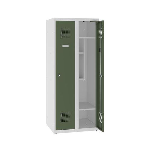 Snížená školní šatní skříň, 2 sloupce, 300 mm, šedá/zelená, tříbodový cylindrický zámek