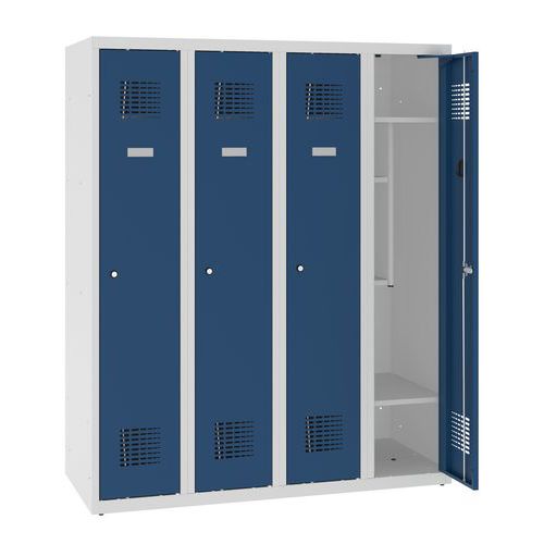 Snížená školní šatní skříň, 4 sloupce, 300 mm, šedá/tmavě modrá, cylindrický zámek