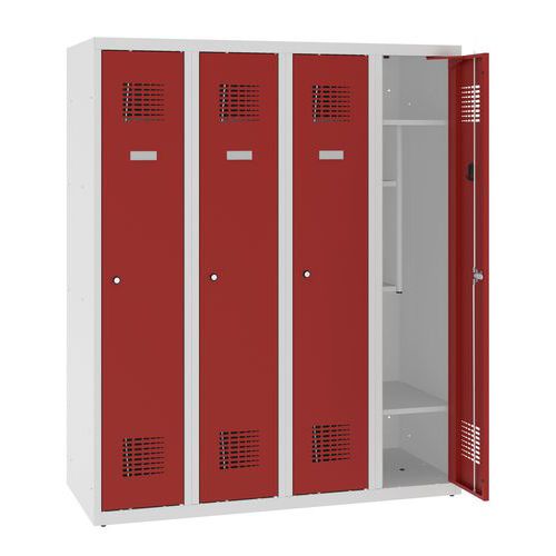 Snížená školní šatní skříň, 4 sloupce, 300 mm, šedá/červená, cylindrický zámek