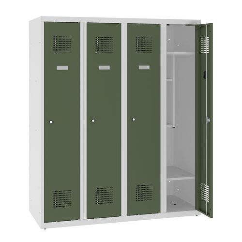 Snížená školní šatní skříň, 4 sloupce, 300 mm, šedá/zelená, cylindrický zámek