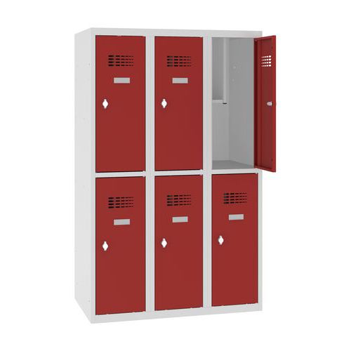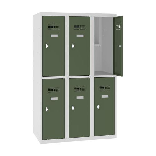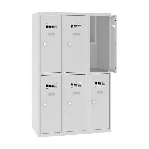 Snížené svařované šatní skříně se šesti oddíly vhodné do škol.