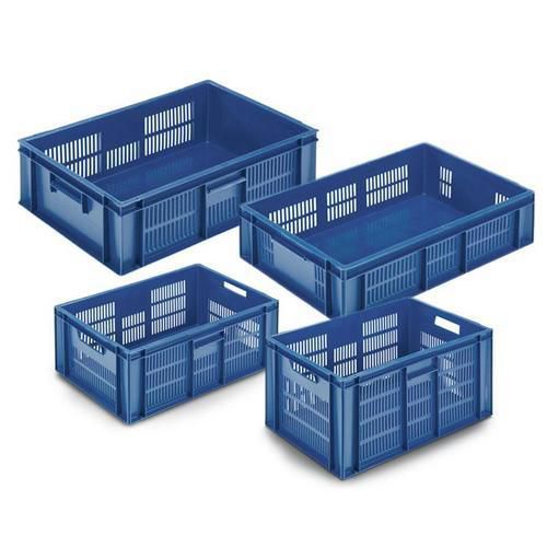 - Stohovatelné polypropylenové přepravky s plným dnem a perforovanými stěnami jsou kompatibilní s euro paletami.