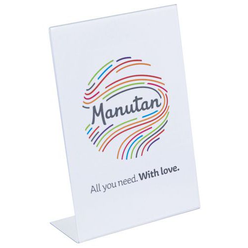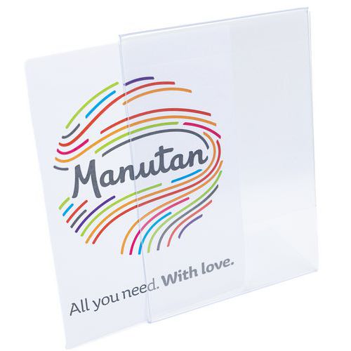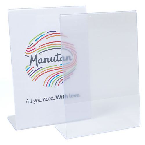 Bezbarvé stolní stojánky L na prospekty s orientací na výšku. Jednostranná prezentace. Vkládání prospektů z boční strany.