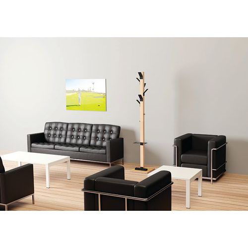 Stylový věšák s osmi háčky na kabáty s velkou kapacitou pro zavěšení. Vybavený držákem na deštníky a miskou na odkapávající vodu. Masivní lakovaný bukový sloupek s barevnými háčky, držákem a miskou na deštníky. Díky velké čtvercové základně je vysoce stabilní. Šest nárazuvzdorných plastových háčků na oděvy. Dva chromované ocelové háčky na příslušenství. Masivní bukový sloupek 6 x 6 mm. Podstavec z překližky 35 cm x 35 cm, tloušťka 2 mm.