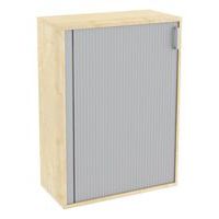 Kancelářská skříň ve dvou barevných variantách s roletou v šedostříbrné barvě, otevírání doleva. Výškově nastavitelné vyrovnávací šrouby.