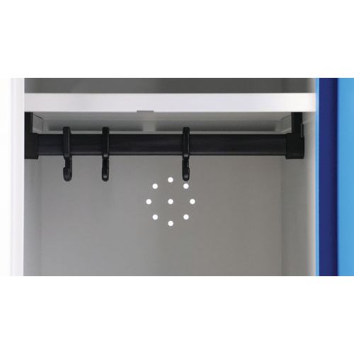 Součástí balení je police, tyč na ramínka a háček na oděvy. Dodáváno se dvěma klíči ke každému boxu.