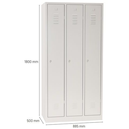 Svařované šatní skříně prémiové kvality skládající se ze tří samostatně uzamykatelných oddílů. Bezpečnost zvyšuje zejména vyztužení dveří po celé délce, a to včetně rámu, a perforace dveří, kterými nelze pohlédnout dovnitř. Šatník z ocelového plechu tloušťky 0,7 mm. Účinné odvádění vlhkosti z oděvů větracími otvory na dveřích. Dveře jsou uloženy na vnitřních výsuvných pantech s možností otevření dveří až 180° a jsou opatřeny plastovými nárazníky pro snížení hluku při zavírání. Uzamykání otočným uzávěrem na visací zámek (lze dokoupit jako příslušenství) nebo cylindrickým zámkem na klíč. Možnost umístění štítku se jménem v horní části dveří. Na vyvýšeném rámu. Možnost dokoupení lavičky pod šatní skříň a šikmé stříšky. Bezpečnostní pokyny: Nábytek postavte na rovný a plochý povrch. Připevněte jej ke zdi nebo k příčce pomocí vhodného upevnění. Dbejte na správné rozmístění zátěže a nepřekračujte maximální povolené zatížení.
