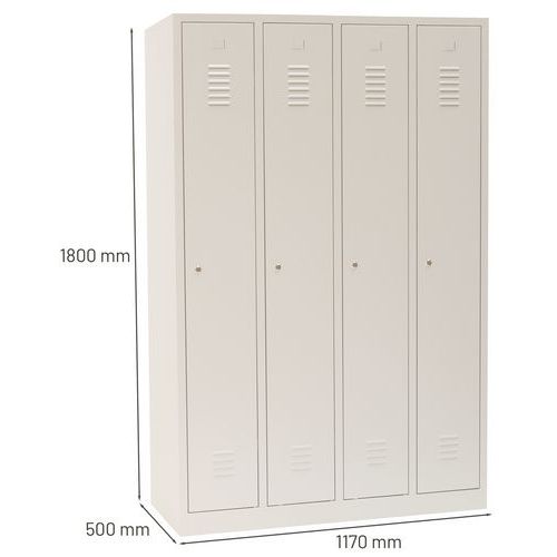 Svařované šatní skříně prémiové kvality skládající se ze čtyř samostatně uzamykatelných oddílů. Bezpečnost zvyšuje zejména vyztužení dveří po celé délce, a to včetně rámu, a perforace dveří, kterými nelze pohlédnout dovnitř. Šatník z ocelového plechu tloušťky 0,7 mm. Účinné odvádění vlhkosti z oděvů větracími otvory na dveřích. Dveře jsou uloženy na vnitřních výsuvných pantech s možností otevření dveří až 180° a jsou opatřeny plastovými nárazníky pro snížení hluku při zavírání. Uzamykání otočným uzávěrem na visací zámek (lze dokoupit jako příslušenství) nebo cylindrickým zámkem na klíč. Možnost umístění štítku se jménem v horní části dveří. Na vyvýšeném rámu. Možnost dokoupení lavičky pod šatní skříň a šikmé stříšky. Bezpečnostní pokyny: Nábytek postavte na rovný a plochý povrch. Připevněte jej ke zdi nebo k příčce pomocí vhodného upevnění. Dbejte na správné rozmístění zátěže a nepřekračujte maximální povolené zatížení.