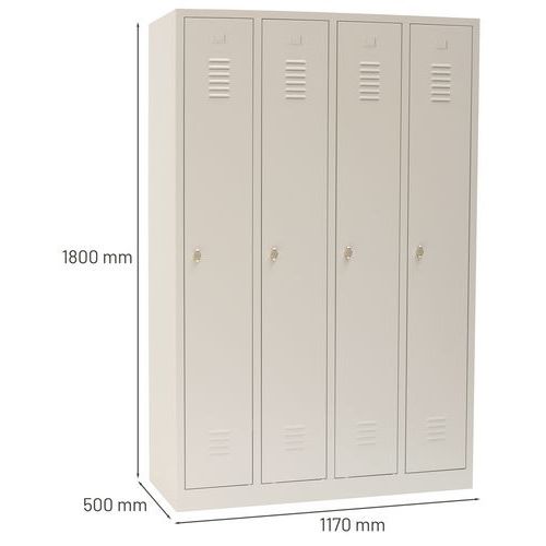 Svařované šatní skříně prémiové kvality skládající se ze čtyř samostatně uzamykatelných oddílů. Bezpečnost zvyšuje zejména vyztužení dveří po celé délce, a to včetně rámu, a perforace dveří, kterými nelze pohlédnout dovnitř. Šatník z ocelového plechu tloušťky 0,7 mm. Účinné odvádění vlhkosti z oděvů větracími otvory na dveřích. Dveře jsou uloženy na vnitřních výsuvných pantech s možností otevření dveří až 180° a jsou opatřeny plastovými nárazníky pro snížení hluku při zavírání. Uzamykání otočným uzávěrem na visací zámek (lze dokoupit jako příslušenství) nebo cylindrickým zámkem na klíč. Možnost umístění štítku se jménem v horní části dveří. Na vyvýšeném rámu. Možnost dokoupení lavičky pod šatní skříň a šikmé stříšky. Bezpečnostní pokyny: Nábytek postavte na rovný a plochý povrch. Připevněte jej ke zdi nebo k příčce pomocí vhodného upevnění. Dbejte na správné rozmístění zátěže a nepřekračujte maximální povolené zatížení.