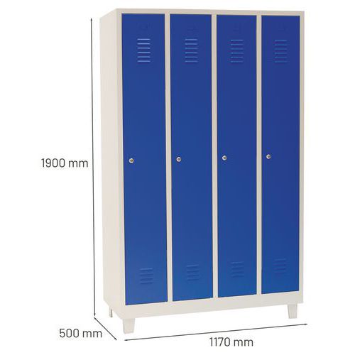 Svařovaná šatní skříň Manutan Expert DURO PROFI na nohách, 4 oddíly, šedá/modrá, cylindrický zámek