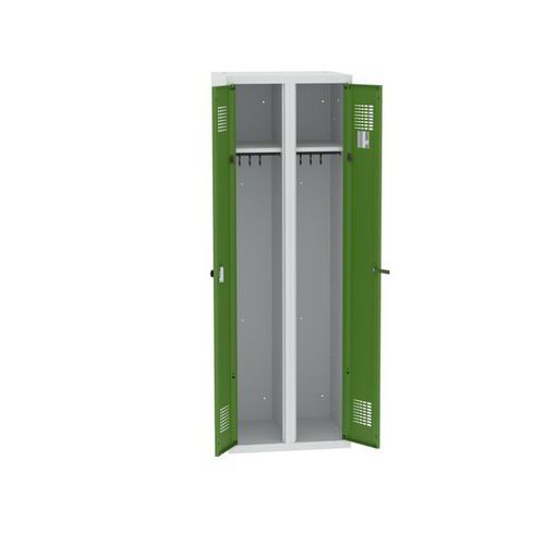 Svařovaná šatní skříň se skládá ze dvou oddílů s jedním společným zámkem. Levé a pravé otevírání dveří umožňuje rychlý přístup do celé skříňky. Vyrobená z ocelového plechu tl. 0,5 mm s vyztuženými svary. Účinné odvádění vlhkosti z oděvů ventilačními otvory na dveřích skříně. Uzamykání na pravém křídle jednobodovým cylindrickým zámkem, levé křídlo má otevírání hliníkovým knoflíkem. Možnost umístění štítku se jménem v horní části dveří. Povrchová úprava práškovou barvou.