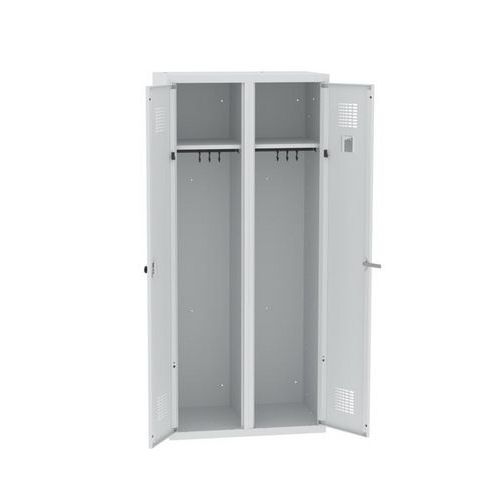 Svařované šatní skříně se skládají ze dvou oddílů s jedním společným zámkem. Levé a pravé otevírání dveří umožňuje rychlý přístup do celé skříňky. Vyrobené z ocelového plechu tl. 0,5 mm s vyztuženými svary. Účinné odvádění vlhkosti z oděvů ventilačními otvory na dveřích skříně. Uzamykání na pravém křídle jednobodovým cylindrickým zámkem, levé křídlo má otevírání hliníkovým knoflíkem. Možnost umístění štítku se jménem v horní části dveří. Povrchová úprava práškovou barvou.