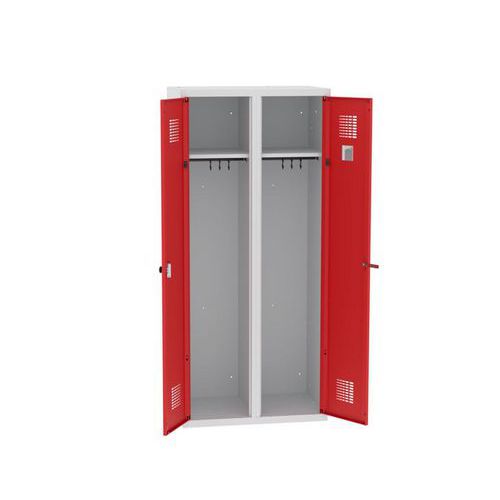 Svařované šatní skříně se skládají ze dvou oddílů s jedním společným zámkem. Levé a pravé otevírání dveří umožňuje rychlý přístup do celé skříňky. Vyrobené z ocelového plechu tl. 0,5 mm s vyztuženými svary. Účinné odvádění vlhkosti z oděvů ventilačními otvory na dveřích skříně. Uzamykání na pravém křídle jednobodovým cylindrickým zámkem, levé křídlo má otevírání hliníkovým knoflíkem. Možnost umístění štítku se jménem v horní části dveří. Povrchová úprava práškovou barvou.